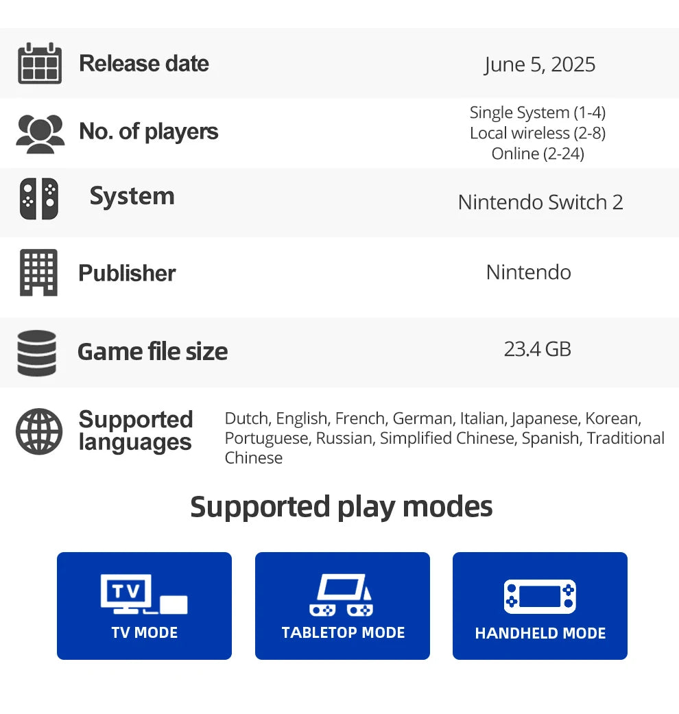 Race across vibrant worlds, challenge rivals in multiplayer, and enjoy the flexibility of playing in TV mode, tabletop mode, or handheld mode. With multilingual support and Nintendo’s authentic physical cartridge, this is a must-have for Mario fans and Switch 2 gamers.